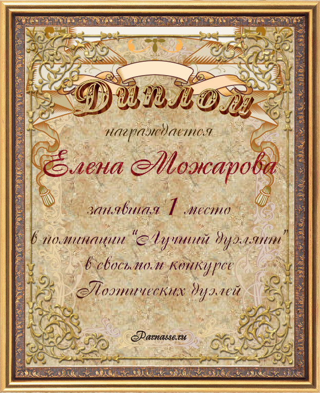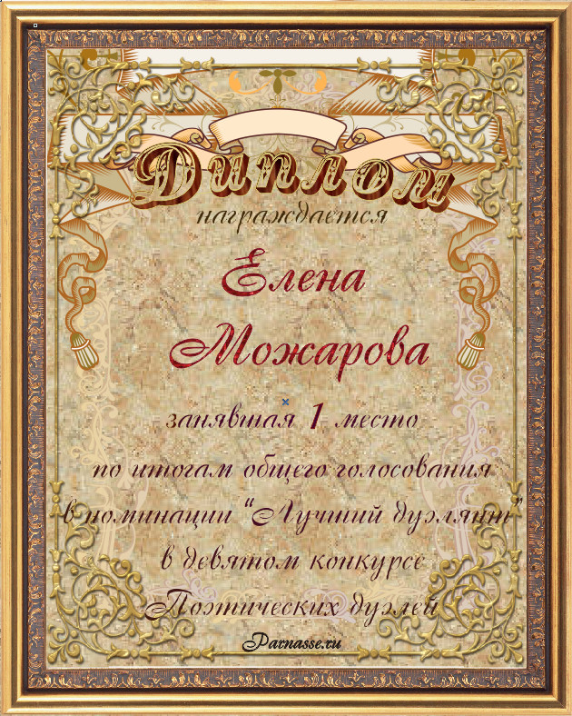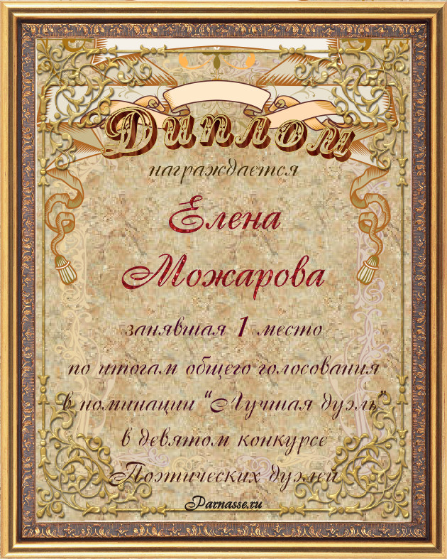 Диплом за 1-е место в номинации "Лучшая дуэль" по итогам общего голосования в девятом конкурсе поэтических дуэлей(№ 1.1)