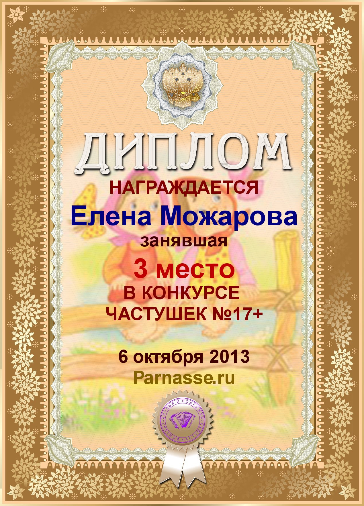 Диплом за победу и 3 место в дополнительной номинации конкурса лимериков № 37+ (17.06.2013 г.)