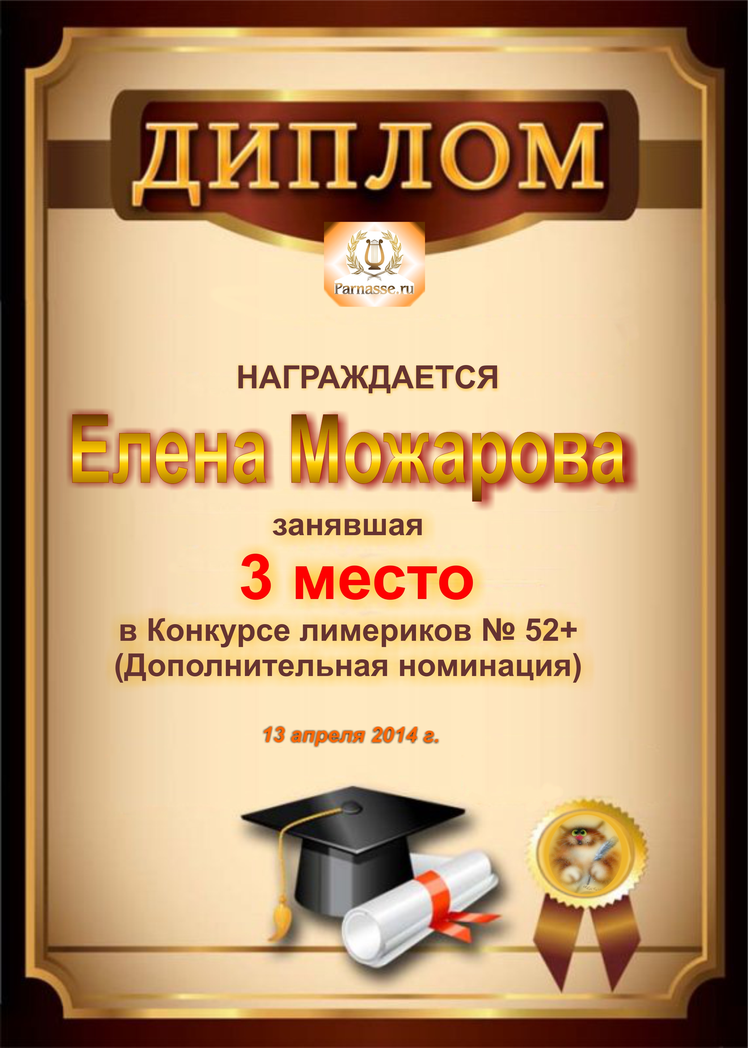 Диплом за победу и 3 место в дополнительной номинации конкурса лимериков № 52+ (13.04.2014 г.)
