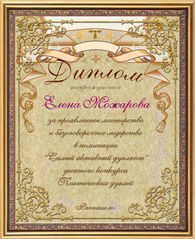 Диплом присуждён в номинации "Самый активный дуэлянт" десятого конкурса поэтических дуэлей