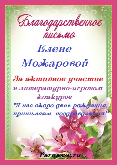 Номинация "Самое необычное поздравление Парнаса с Днём Рождения"Хочется выразить Вам, Елена, огромнейшую благодарность за неординарное яркое поздравление! Мы благодарны Вам за, то, что именно "Парнас" стал для Вас теплым и дружеским домом, кругом друзей, помощником в публикации своих замечательных произведений в Интернете!