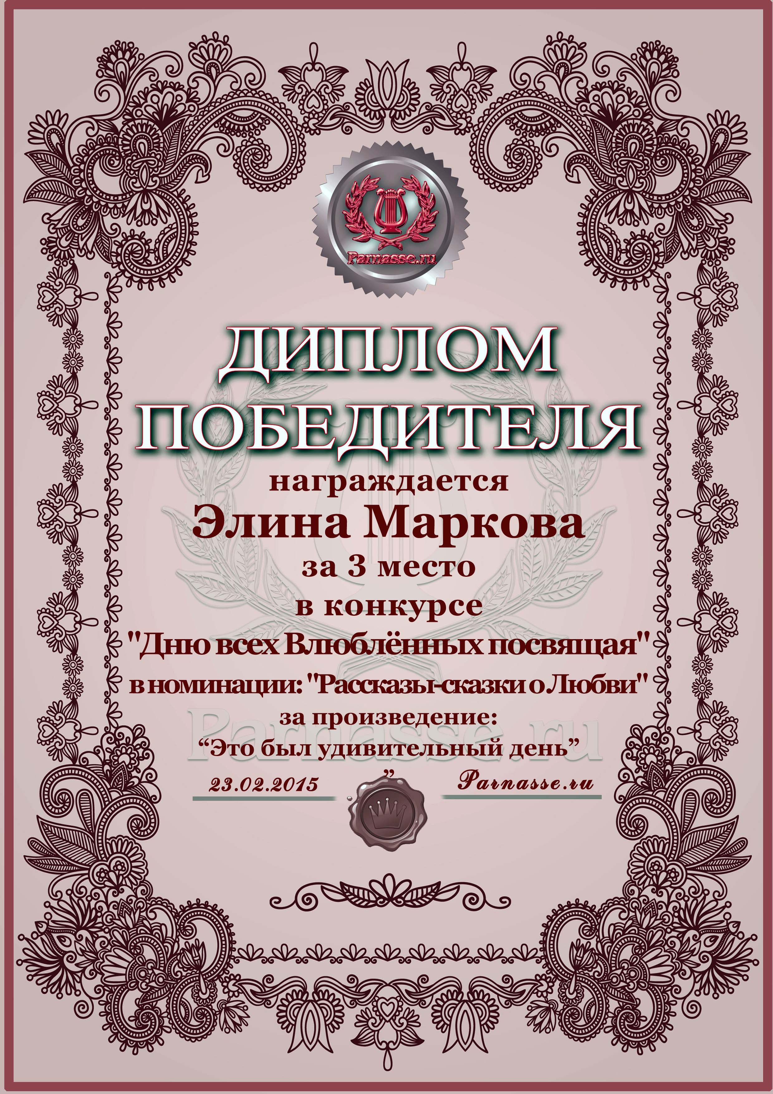 Третье место в конкурсе "Дню всех Влюблённых посвящая", прозаическая номинация, судейское голосование, произведение "Это был удивительный день". Поздравляем!