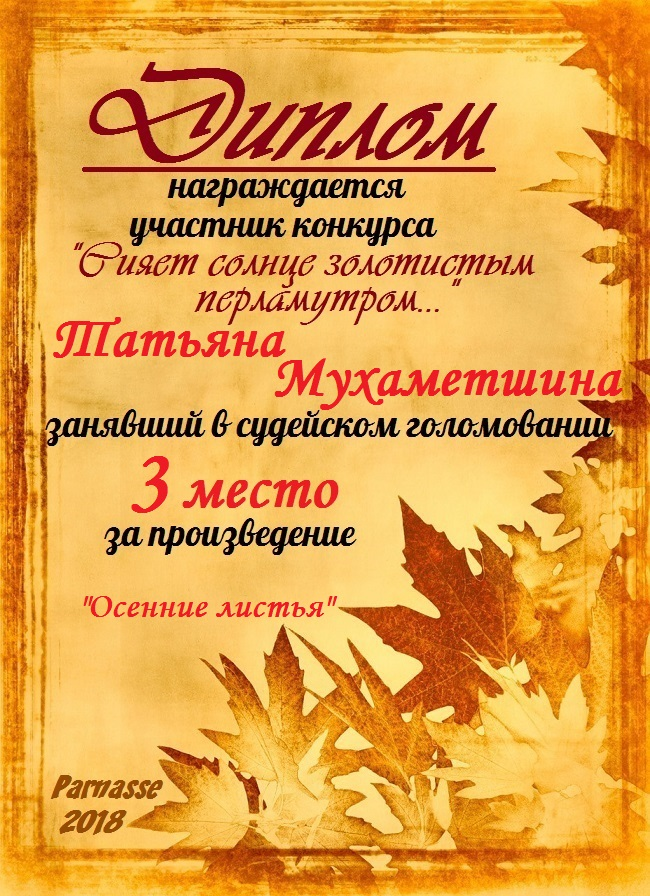 Третье место в ЛитКонкурсе "Литературный букет осеннего великолепия", в поэтической номинации " Сияет солнце золотистым перламутром…", судейское голосование. Поздравляем с прекрасной победой!