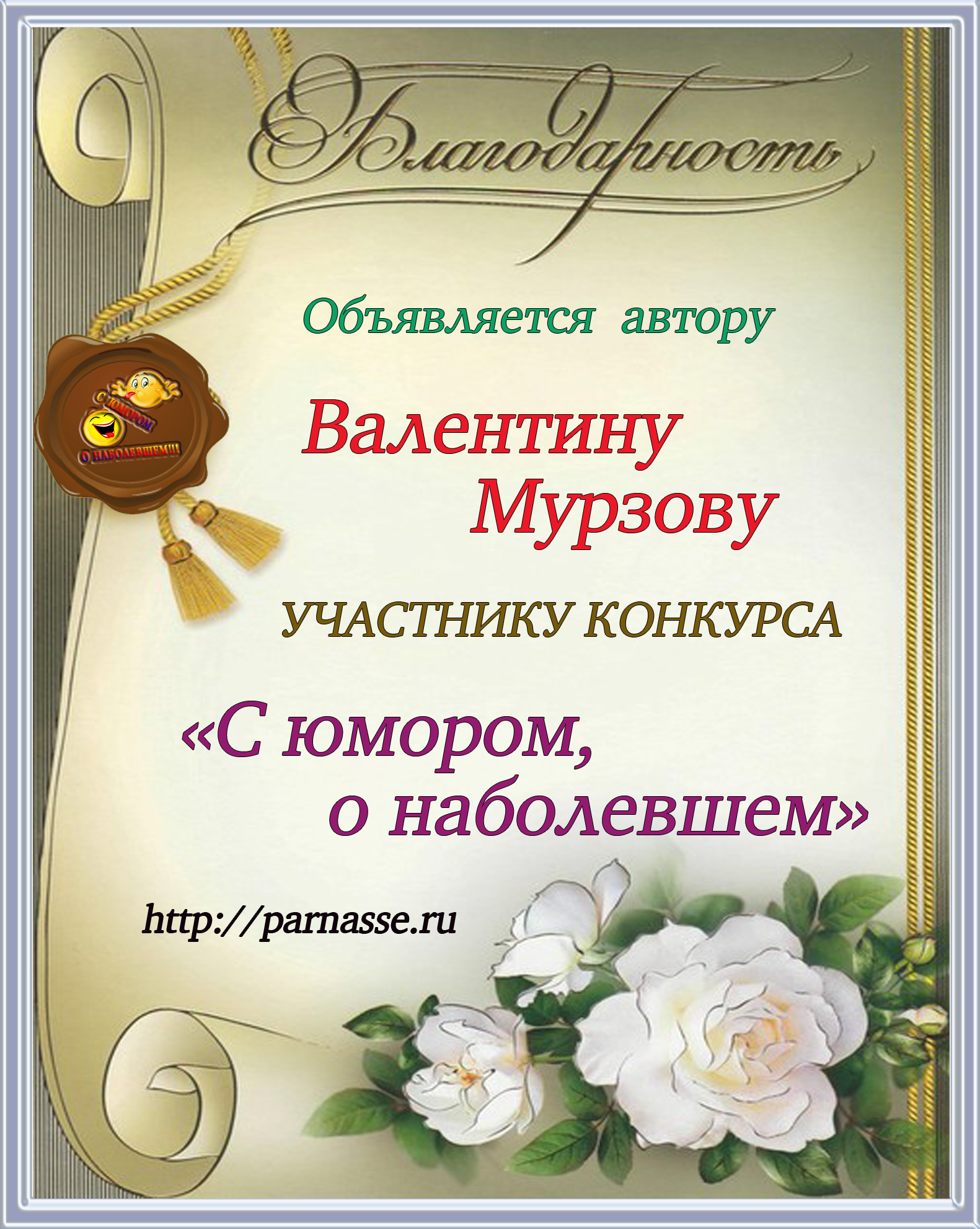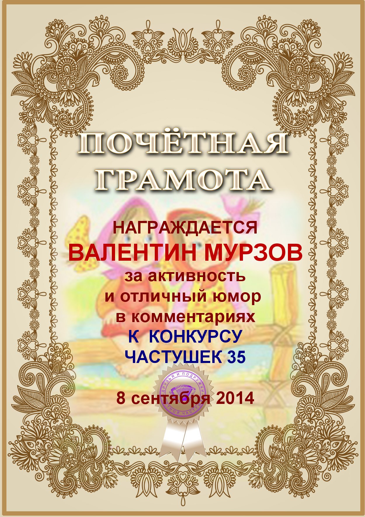 Грамота за активное участие и отличный юмор в комментариях к конкурсу частушек №35