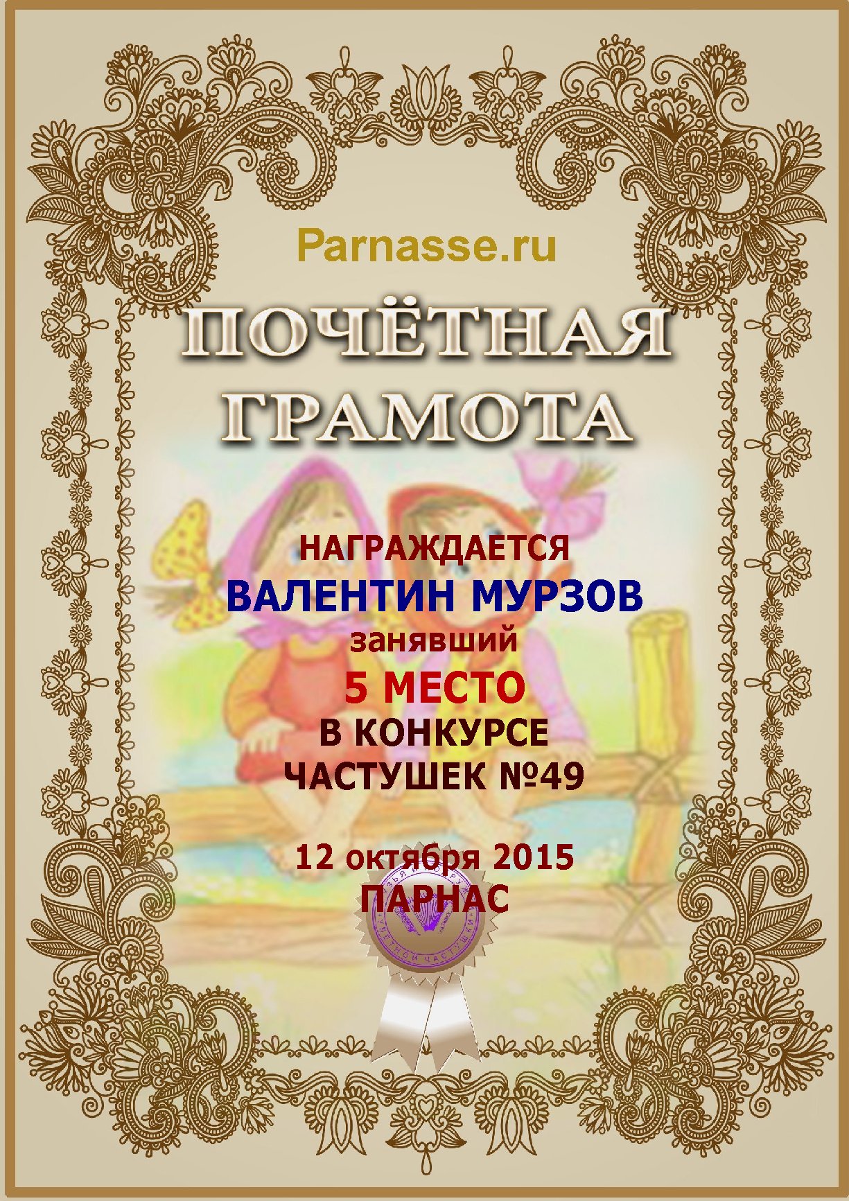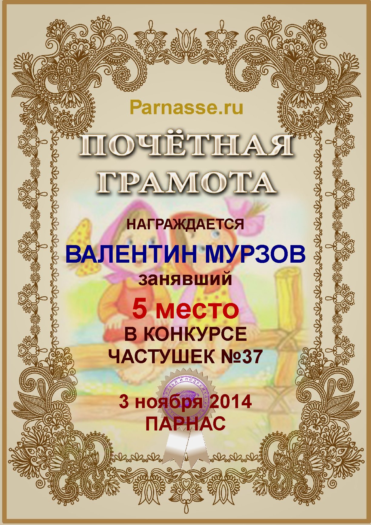 Похвальная грамота за 5 место и активное участие в конкурсе лимериков № 62+ (24.11.2014 г.)