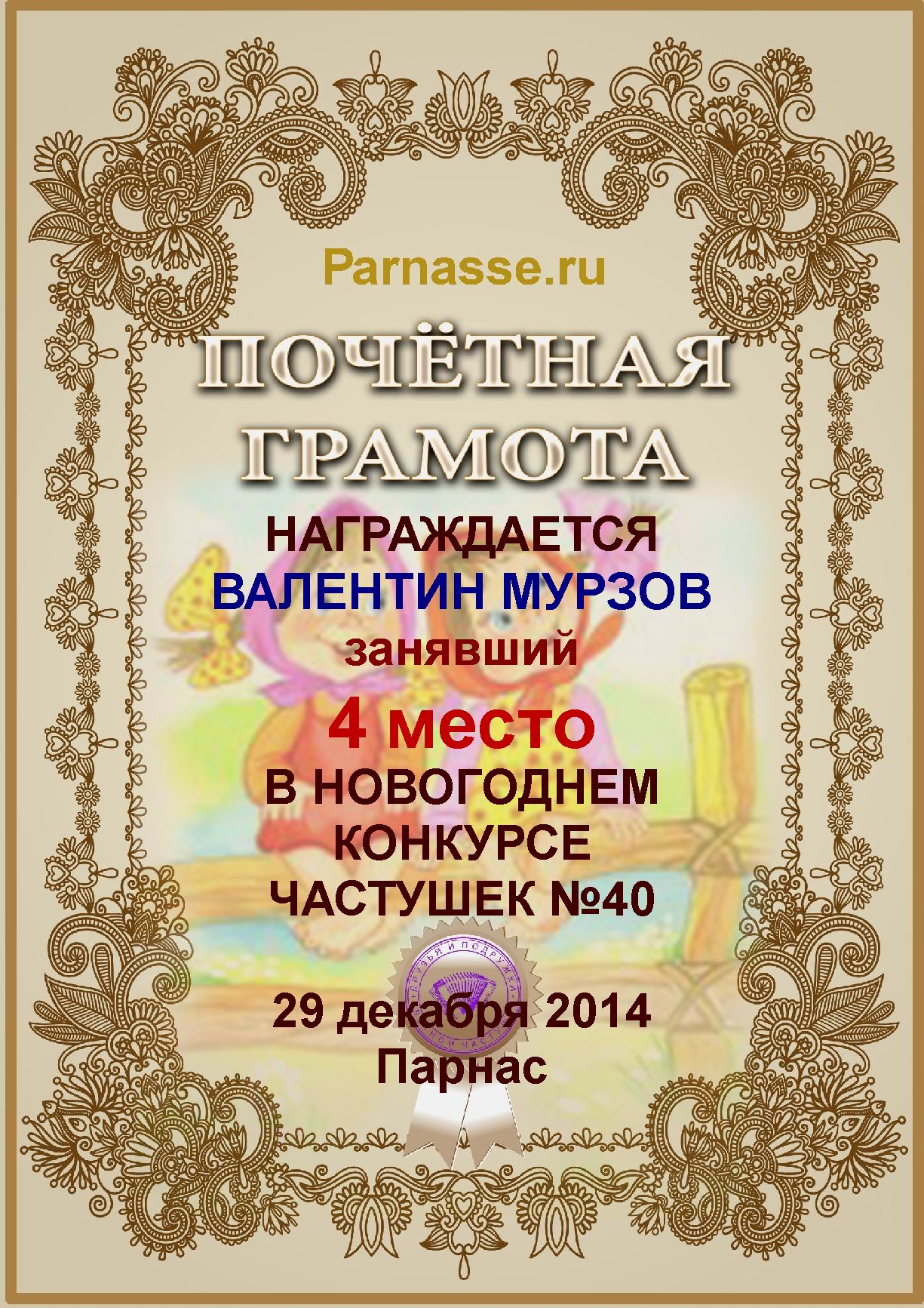 Похвальная грамота за 4 место и активное участие в конкурсе лимериков № 63+ (22.12.2014 г.)