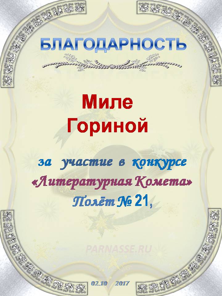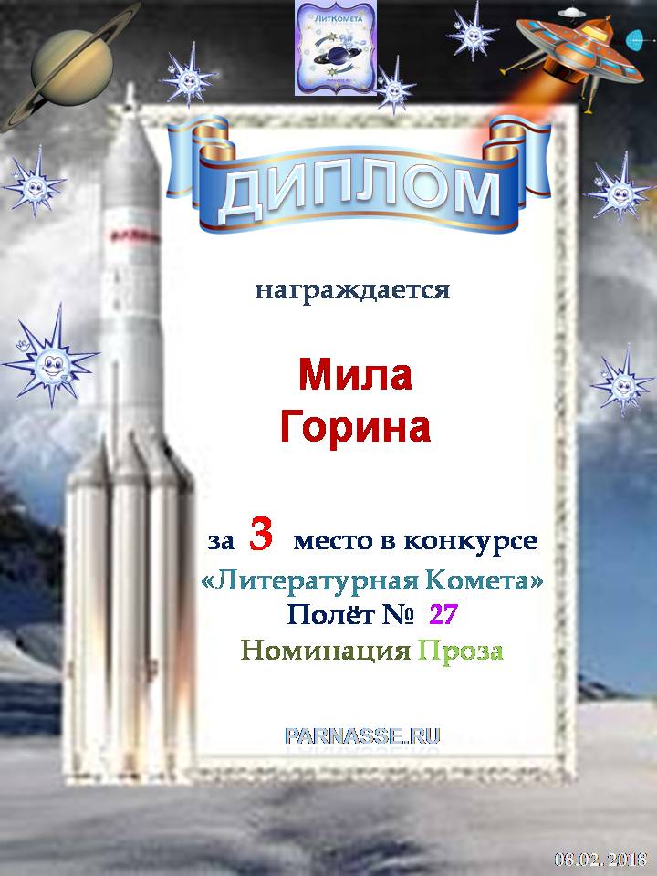 За 3 место в номинации "Проза" в конкурсе "Литературная Комета - Полёт № 27"