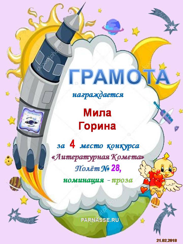 Поздравляю с 4 местом в конкурсе "ЛитКомета" Полёт № 28 - номинация Проза!
