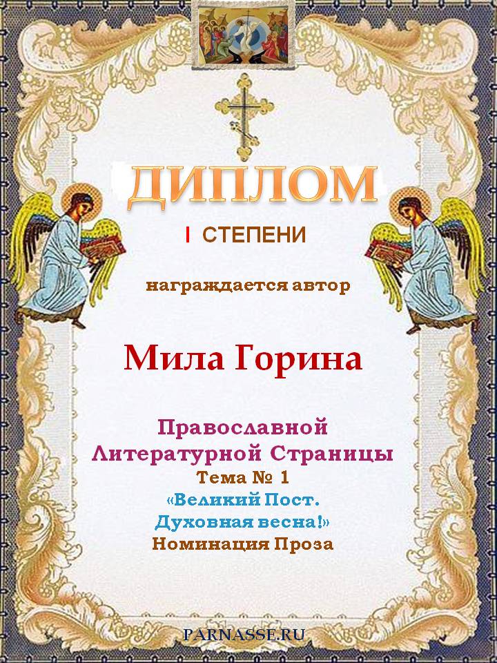 За прекрасную победу на Православной Литературной Странице, Тема № 1 "Великий Пост. Духовная весна!" Номинация Проза. Судейское голосование.