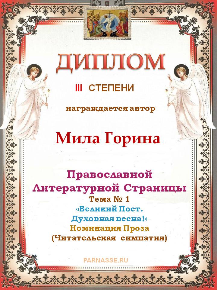 За достойную победу на Православной Литературной Странице, Тема № 1 "Великий Пост. Духовная весна!" Номинация Проза. Читательская симпатия..