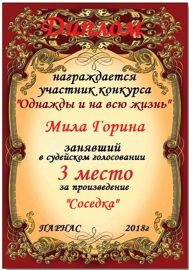 Третье место в конкурсе "Однажды и на всю жизнь" в номинации "Сказание о Любви", произведение "Соседка", судейское голосование. Поздравляем с победой!