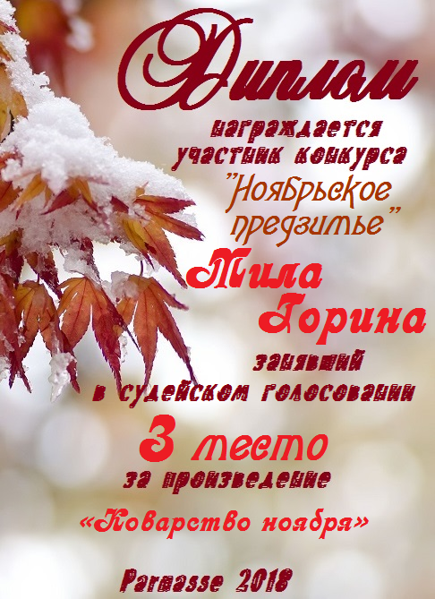 Третье место в ЛитКонкурсе "Литературный букет осеннего великолепия", в прозаической номинации " Ноябрьское предзимье", народное голосование. Поздравляем с прекрасной победой!