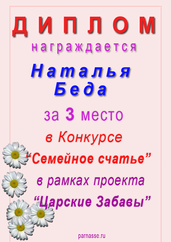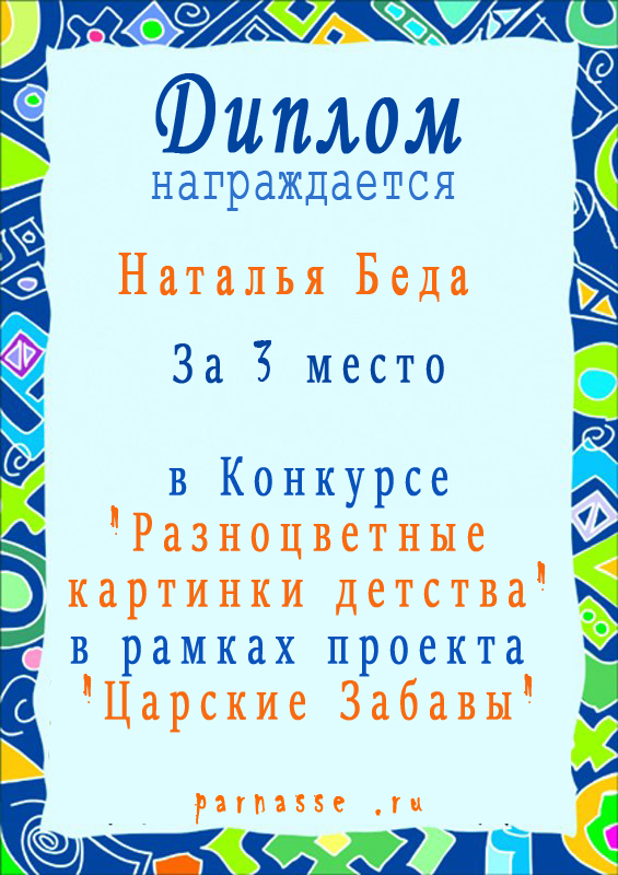 За 3 место в Конкурсе "Разноцветные картинки детства" в рамках проекта "Царские Забавы"