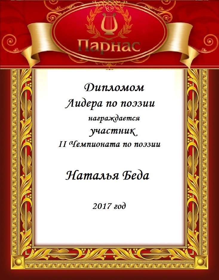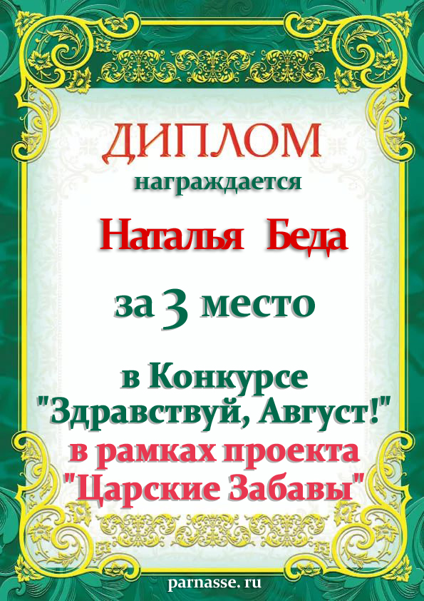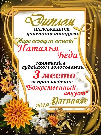 Третье место в ЛитКонкурсе "Улыбка августа", в поэтической номинации "Жара поэту не помеха". Судейское голосование. Поздравляем! Спасибо за активное участие! Ждем Ваши великолепные, замечательные стихи на новых конкурсах Парнаса. Творческого долголетия Вам и всех благ!