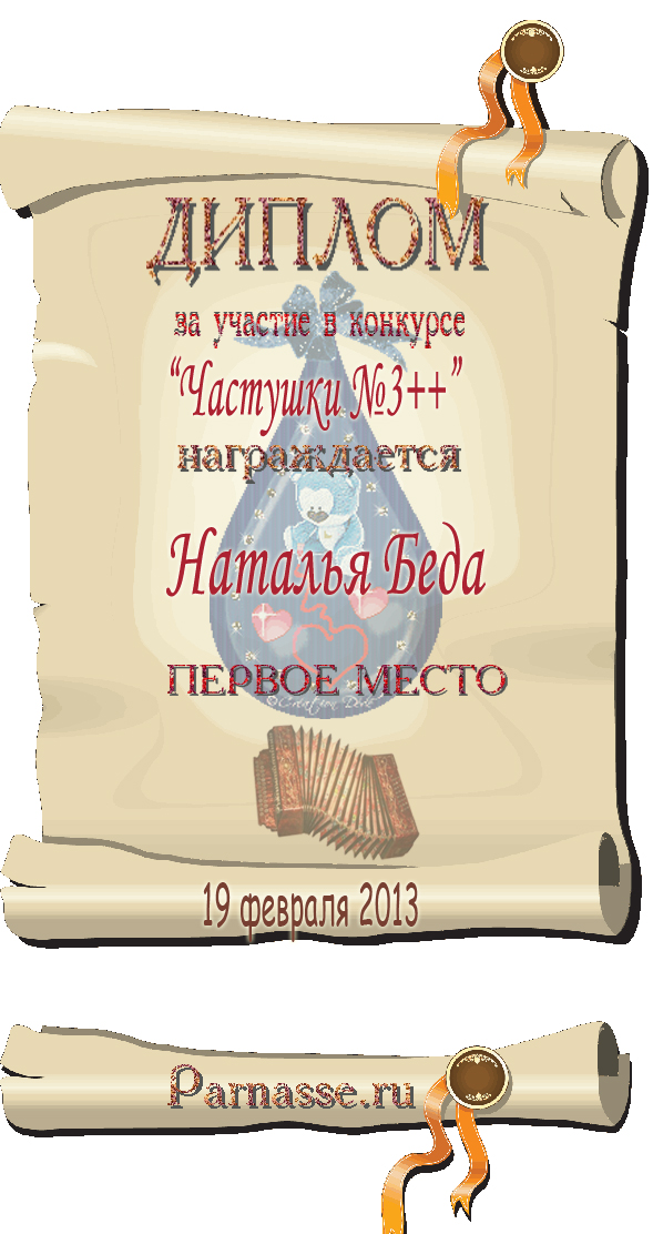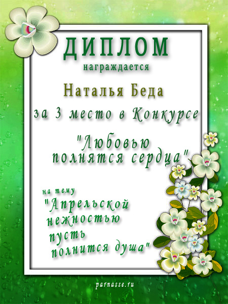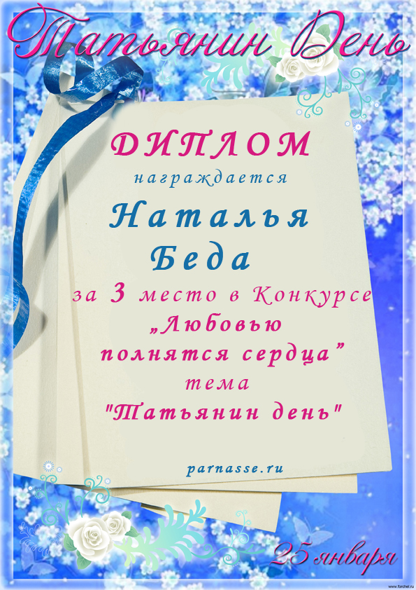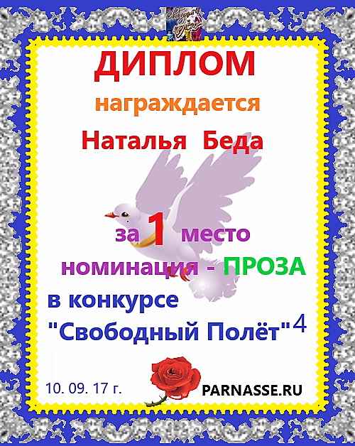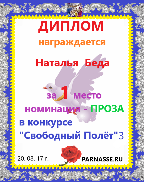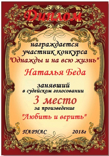 Третье место в конкурсе "Однажды и на всю жизнь" в номинации "Сказание о Любви", произведение "Любить и верить", судейское голосование. Поздравляем с победой!