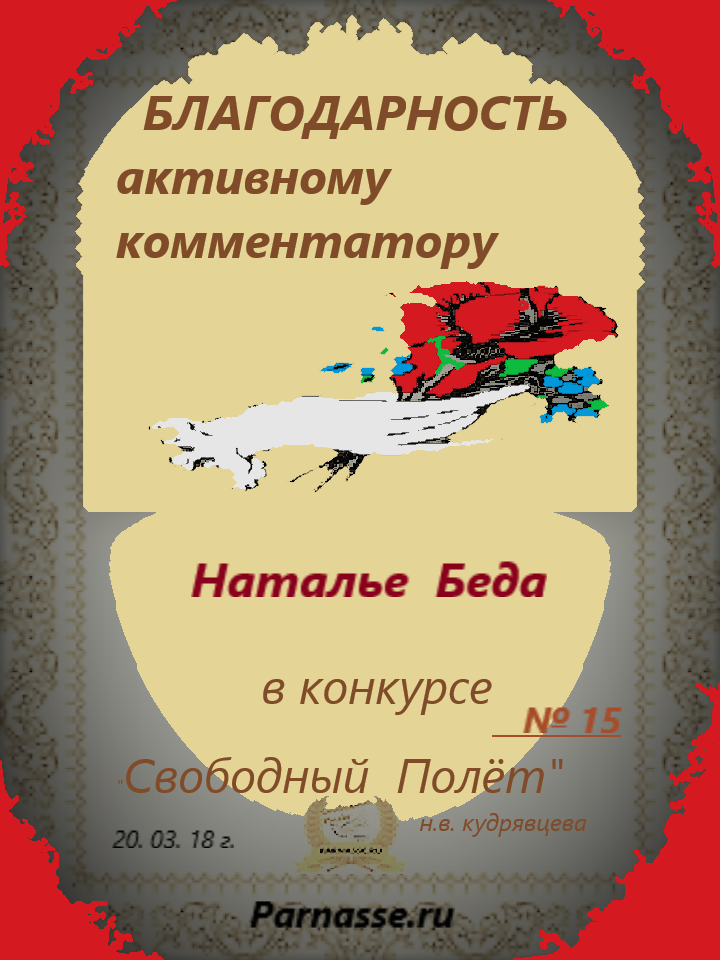 За активное участие в обсуждении конкурсных произведений 3-го тура Первого Поэтического Турнира «Стихи с эпиграфами». Спасибо за поддержку!