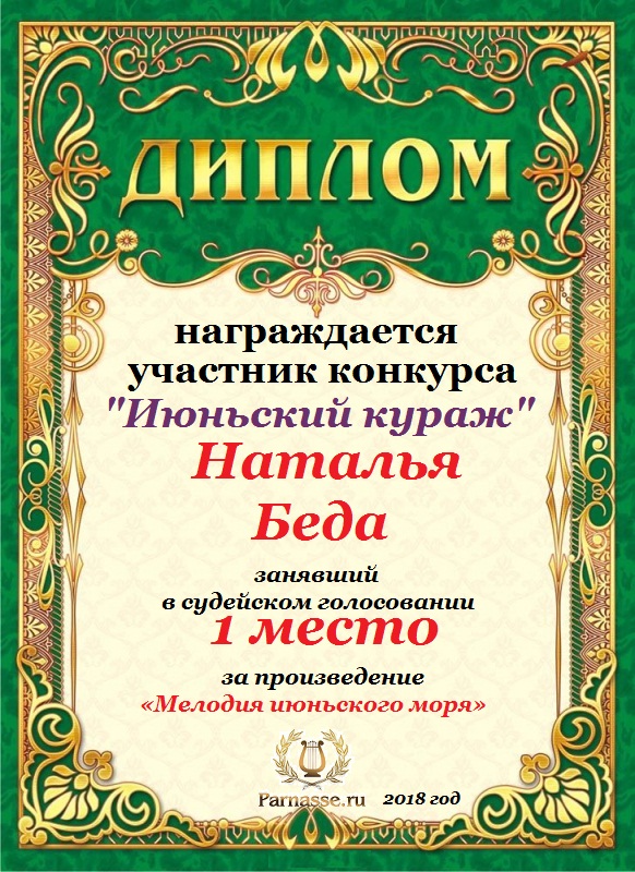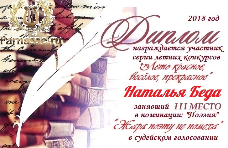 Третье место в серии летних литконкурсов "Лето красное, весёлое, прекрасное", в поэтической номинации "Жара поэту не помеха". Народное голосование. Поздравляем с победой!