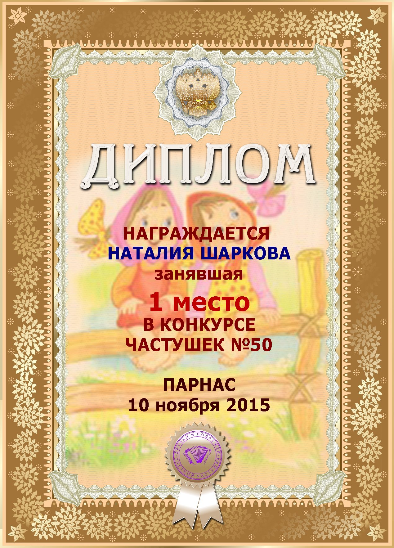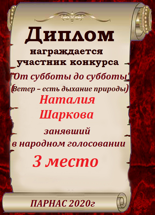 Третье место по итогам конкурса «Ветер снова мне шепчет о счастье ", народное голосование. Поздравляем с прекрасной победой!