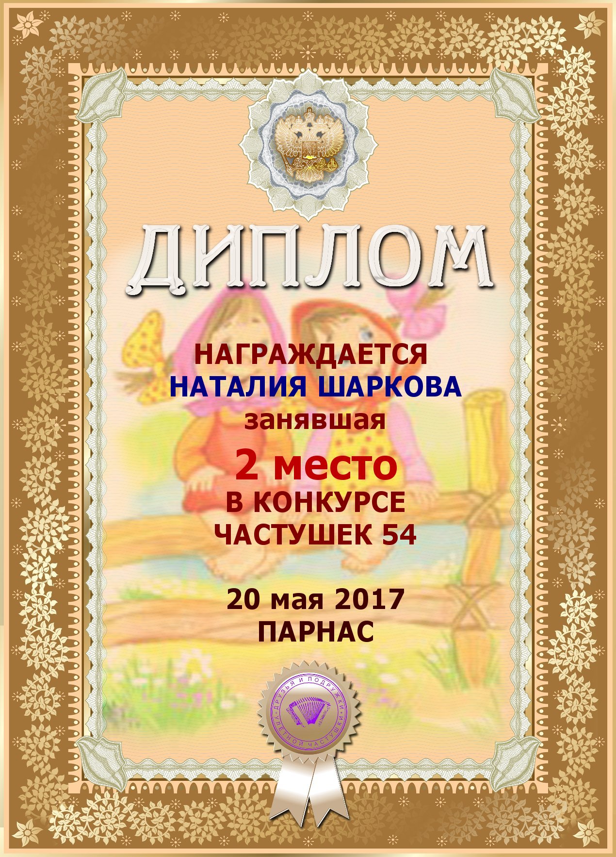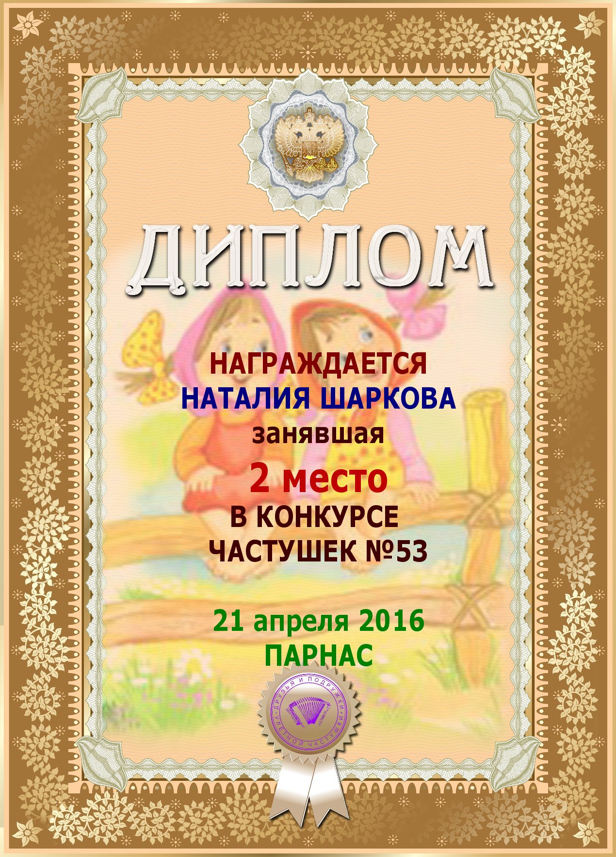 Второе место по итогам конкурса «Ветер снова мне шепчет о счастье ", по итогам судейского голосования. Поздравляем с прекрасной победой!