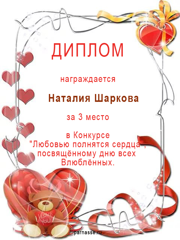 Поздравляю! 3 место в Конкурсе "Любовью полнятся сердца", посвящённому дню всех влюблённых!