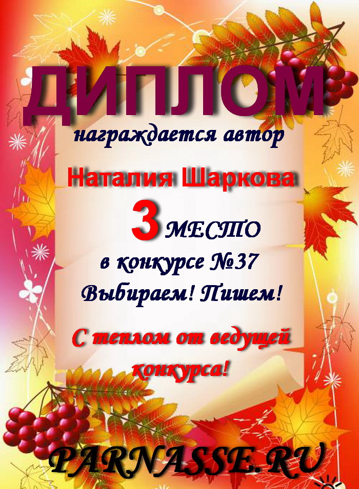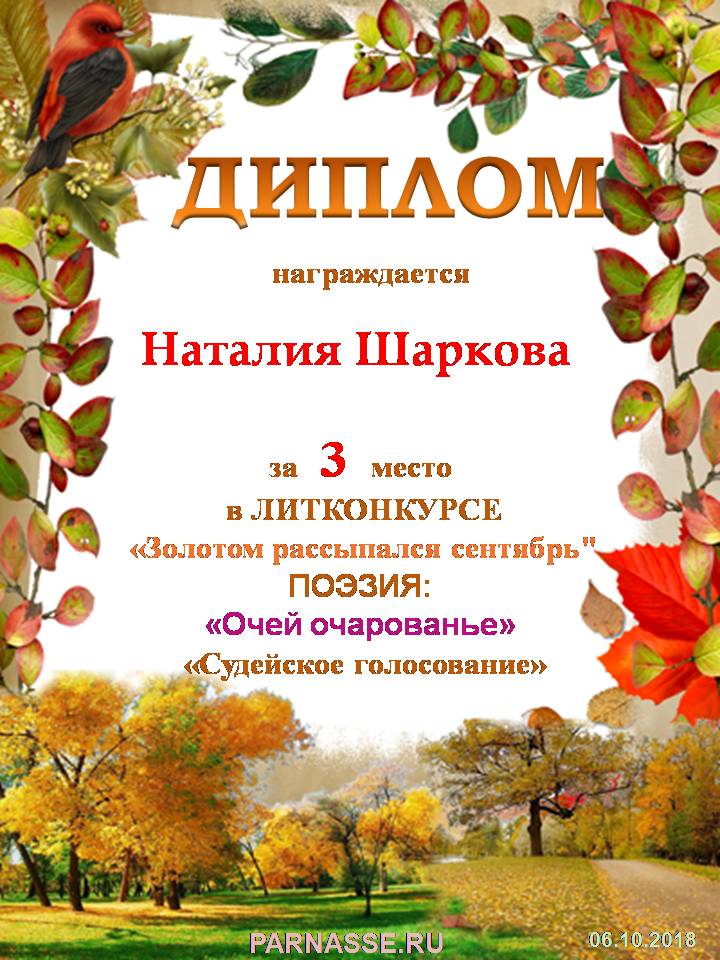 Третье место в конкурсе "Золотом рассыпался сентябрь", в поэтической номинации "Очей очарование", судейское голосование. Поздравляем!