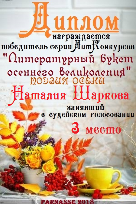 Третье место в серии ЛитКонкурсов "Литературный букет осеннего великолепия", в поэтической номинации "ПОЭЗИЯ ОСЕНИ", судейское голосование. Поздравляем с прекрасной победой!