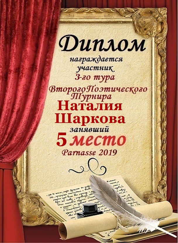 Восьмое место в 5-м туре Первого Поэтического Турнира «Наедине с бумагой и пером» за произведение «ТЕБЕ ПИШУ». Поздравляем!