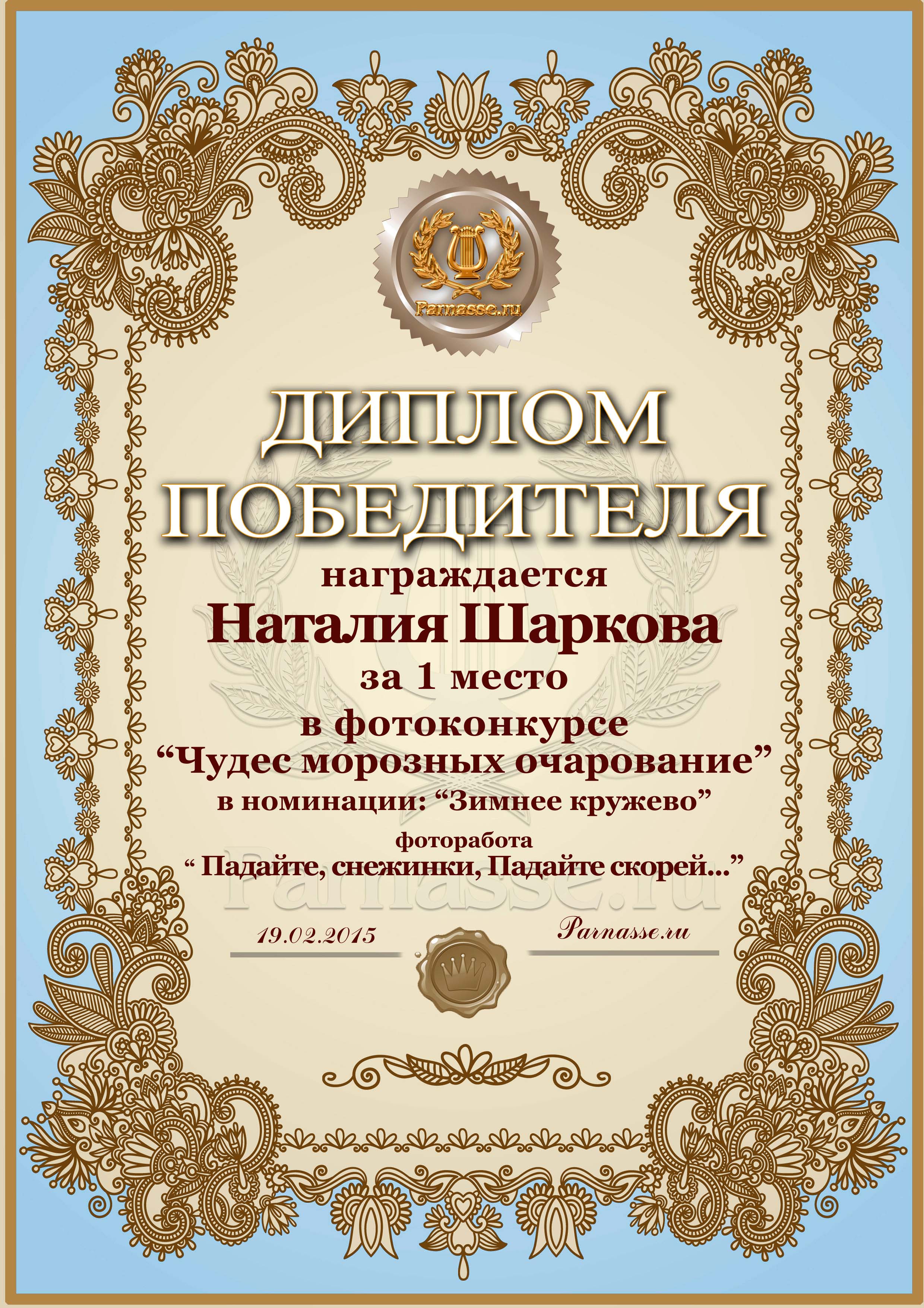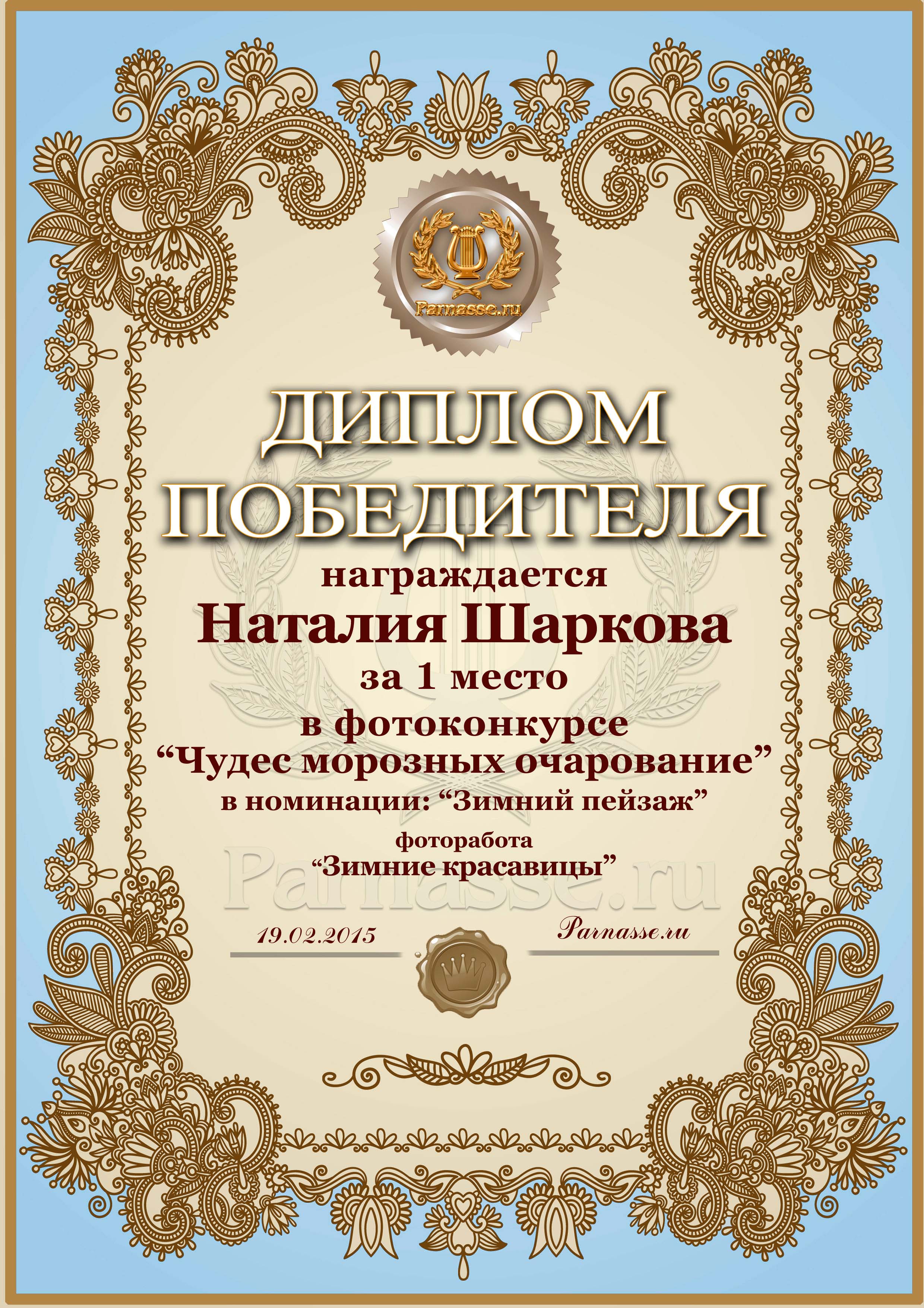 Диплом за 1 место в фотоконкурсе "Чудес морозных очарование"