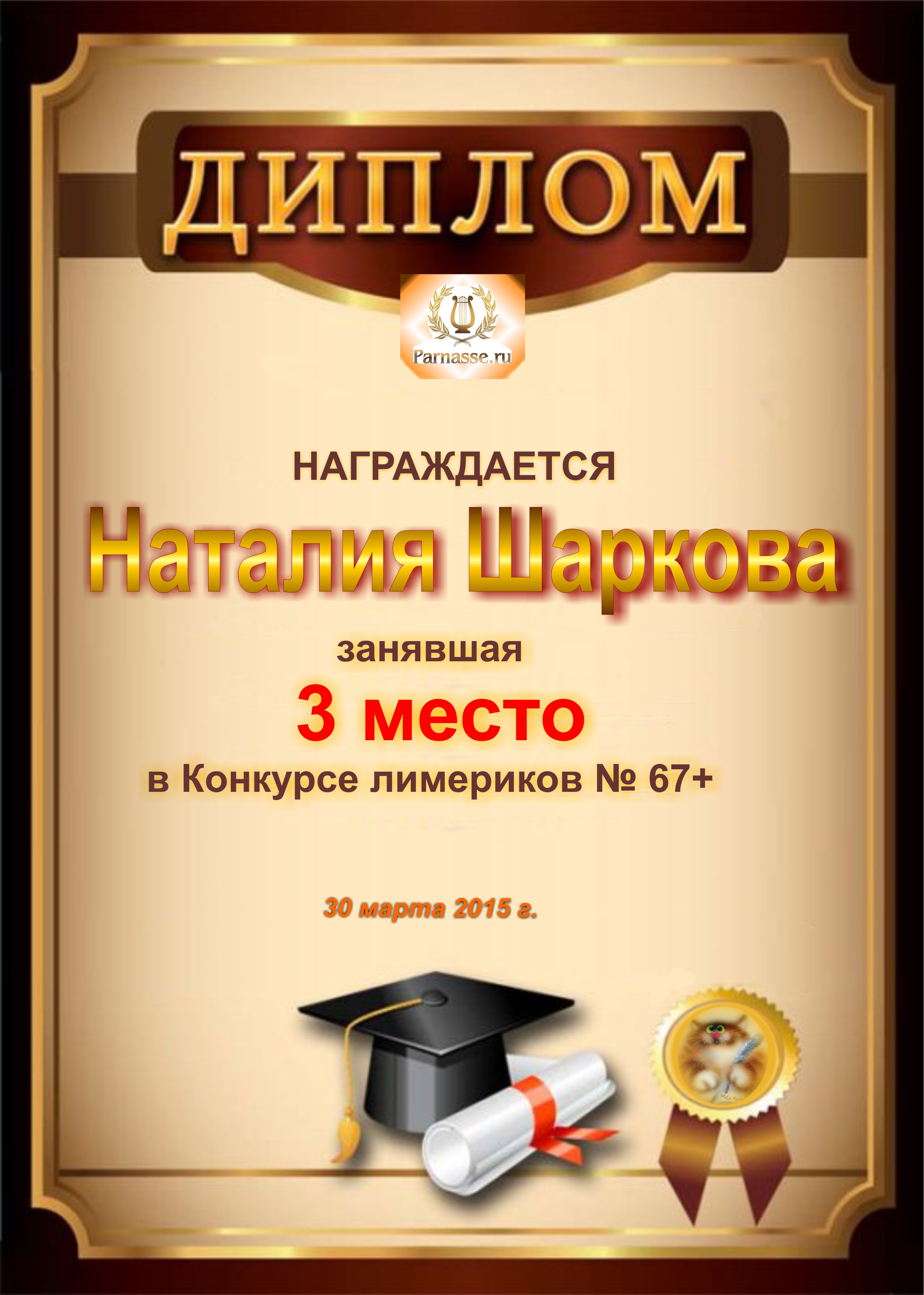Похвальная грамота за 4 место и активное участие в конкурсе лимериков № 67+ (30.03.2015 г.)