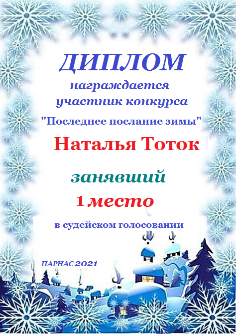 ПЕРВОЕ место в конкурсе "Последнее послание зимы" в поэтической номинации, судейское голосование. Поздравляем с заслуженной, прекрасной Победой! Примите от нас искренние пожелания мира и добра, солнца, тепла и света! Улыбок друзей и заботы родных!