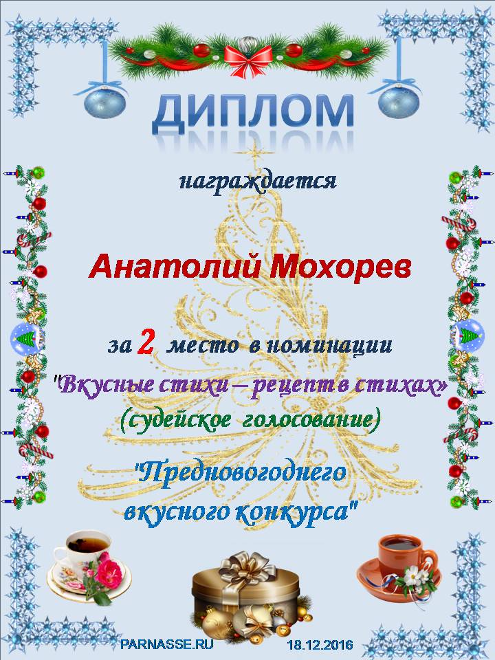 Второе место в музыкально-литературном конкурсе "Предновогодний Вкусный" в номинации "Вкусные стихи - рецепт в стихах", произведение "Торт "Графские развалины"", судейское голосование. Поздравляем с блестящей победой. От всей души поздравляем Вас, Анатолий, с наступающим Новым 2017 Годом! Счастья и радости, здравия и всех благ, удачи на все года!