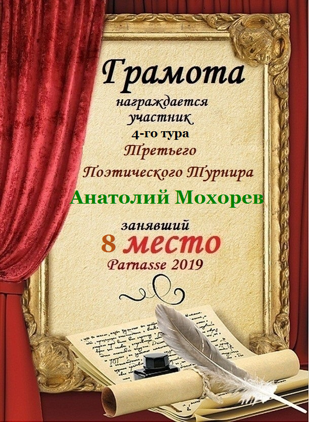 Четвёртое место в 5-м туре Третьего Поэтического Турнира " Я тебе подарю…" за произведение «Я тебе подарю...». Поздравляем!