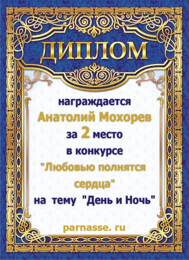 За 2 место в конкурсе "Любовью полнятся сердца" на тему "День и Ночь"