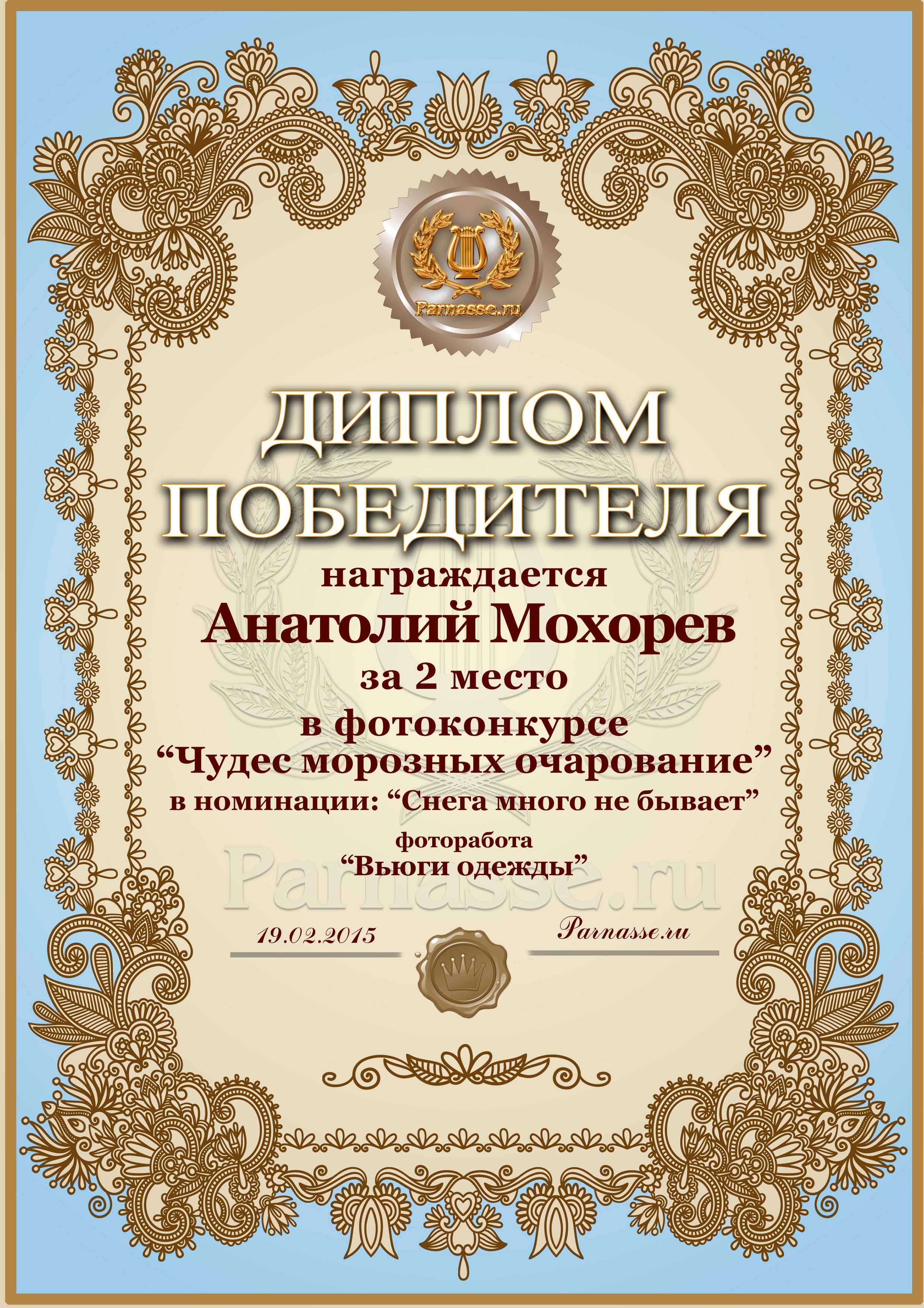 Диплом за 2 место в фотоконкурсе "Чудес морозных очарование"