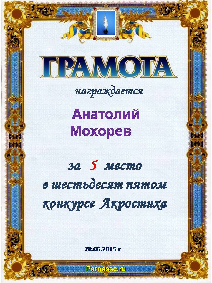 Грамота за 5 место в 102 конкурсе АКРОСТИХА (Альтернатива)! ПОЗДРАВЛЯЮ!