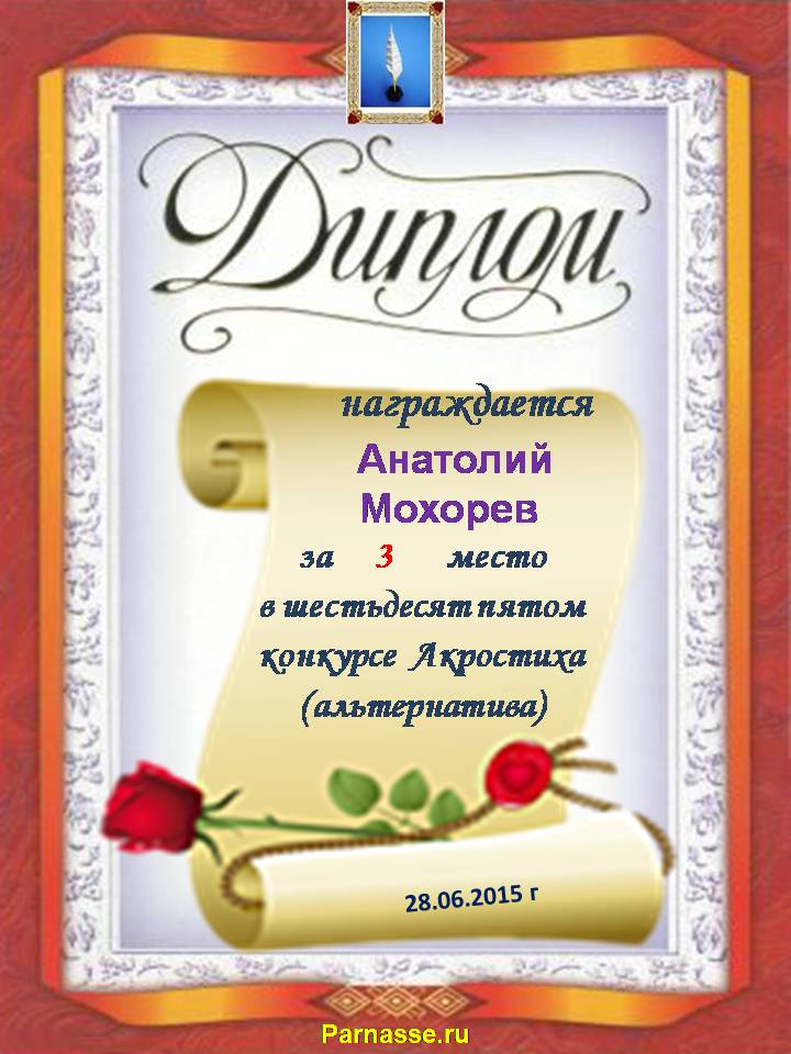 Диплом за 1 место в 103 конкурсе АКРОСТИХА (Альтернатива)! ПОЗДРАВЛЯЮ!