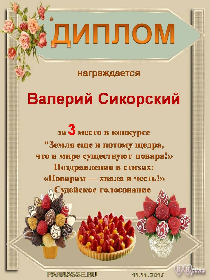 Поздравляем с 3 местом! Номинация: Поздравления в стихах: Поварам честь и хвала! - судейское голосование.