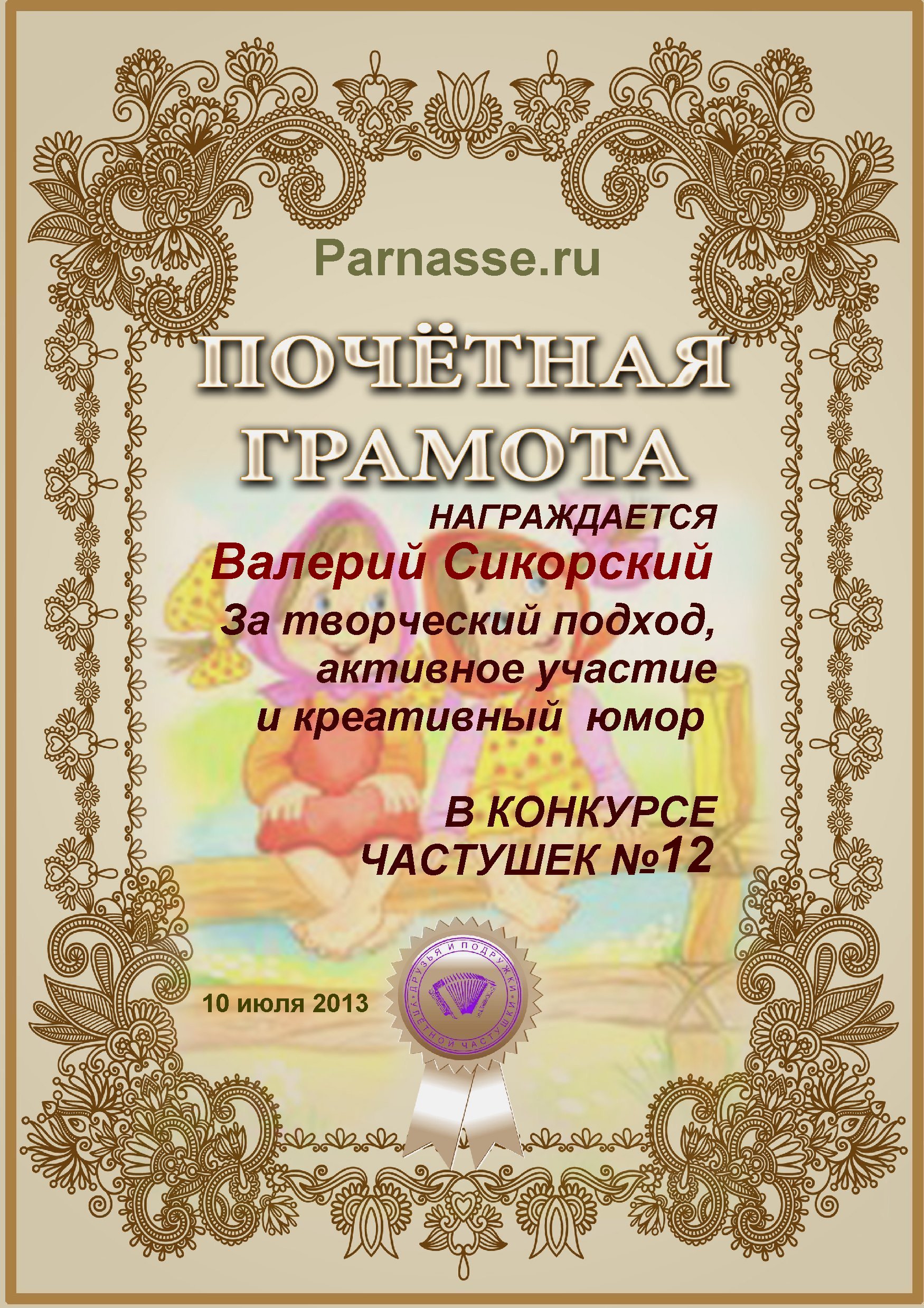 Грамота за участие в конкурсе частушек №12