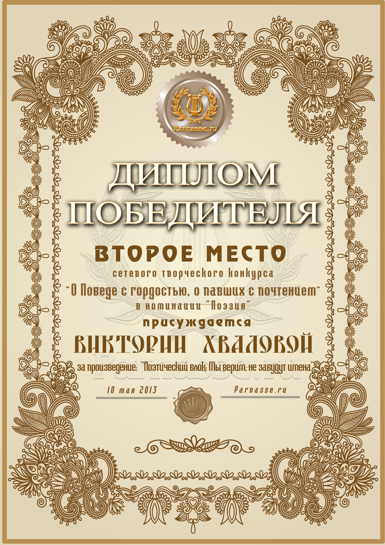 Третье место в музыкально-литературном конкурсе «О Победе с гордостью, о павших – с почтением!» Общее голосование. Номинация в поэзии «Солдаты Великой Победы»! Произведение «Мы верим, не забудут имена»! Поздравляем с блестящей победой!