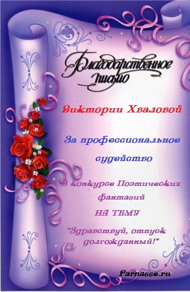 Благодарим Вас за участие в летнем ярком конкурсе, в прозаической номинации! Удачи Вам и радости! Всего самого доброго и прекрасного!