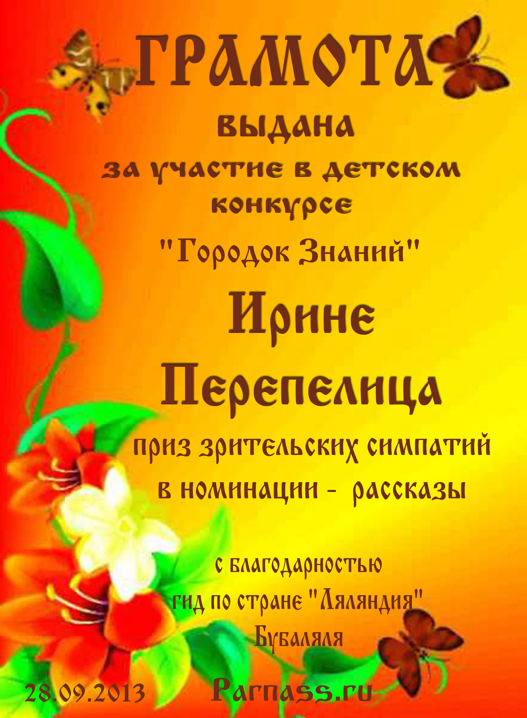 Диплом за 1 место в праздничном конкурсе "Поздравим Парнас с трёхлетием вместе!"