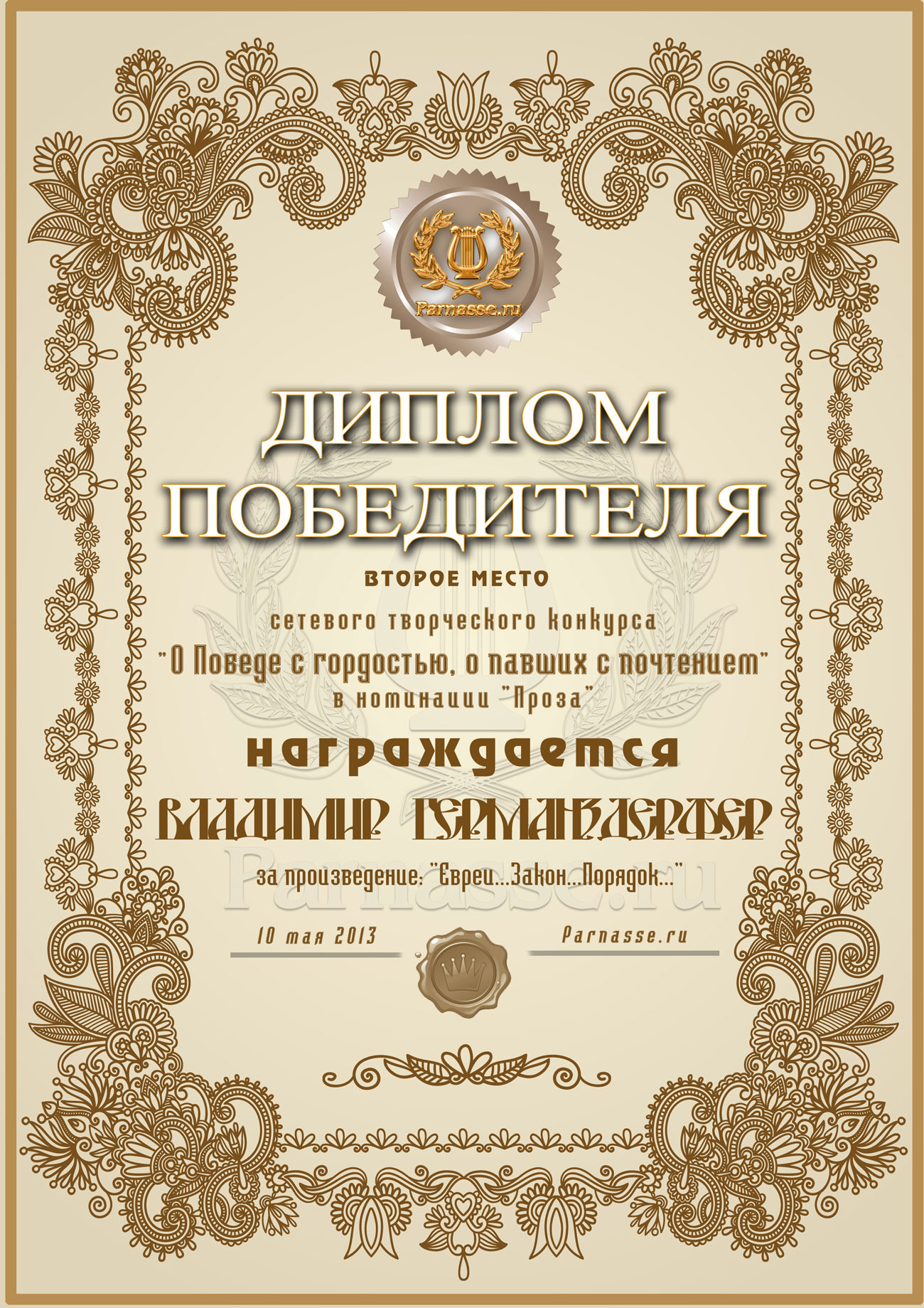 Второе место в музыкально-литературном конкурсе «О Победе с гордостью, о павших – с почтением!» Судейское голосование. Номинация в прозе «ВЕЛИКАЯ ОТЕЧЕСТВЕННАЯ ВОЙНА»! Произведение «Евреи... Закон...Порядок...»! Поздравляем с блестящей победой!