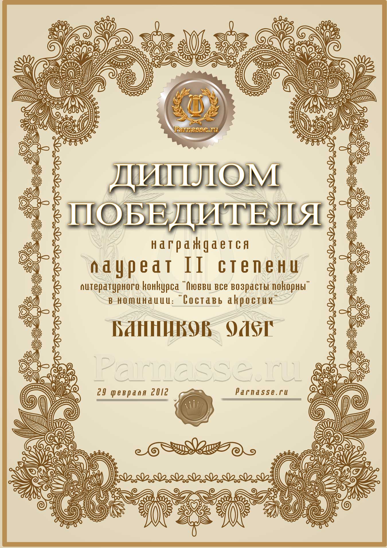 ![]() Лауреат II степени литературного конкурса «Любви все возрасты покорны»!