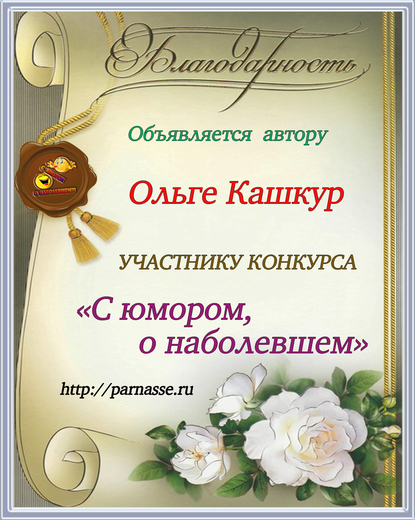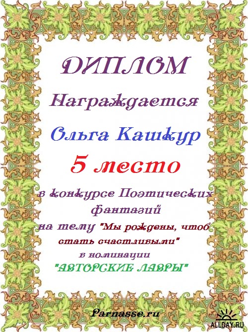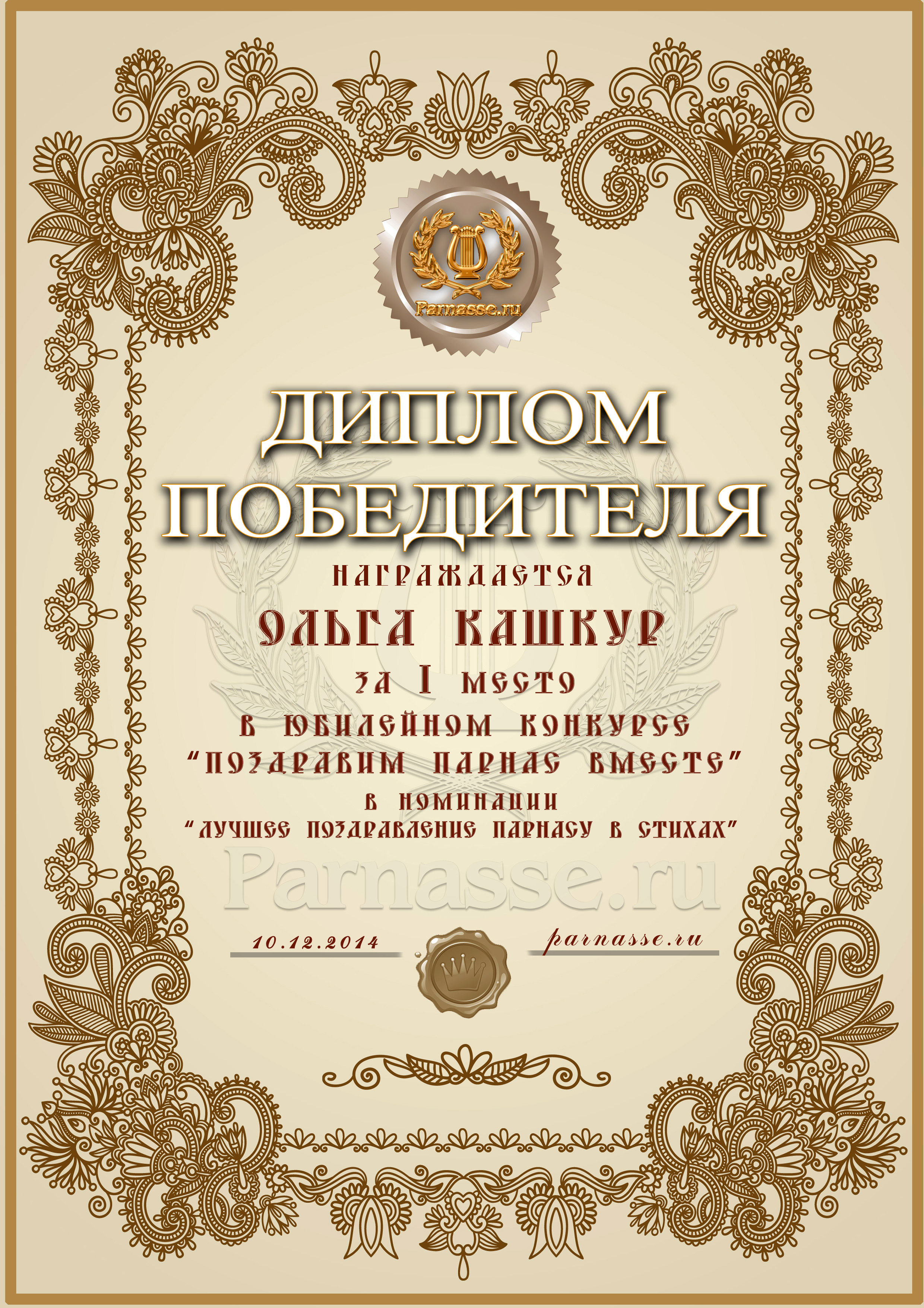 Первое место в праздничном конкурсе "ПОЗДРАВИМ ПАРНАС ВМЕСТЕ!", в номинации "Лучшее стихотворное поздравление Парнасу". Позвольте от всей души выразить Вам благодарность за прекрасные поэтические слова поддержки, самые тёплые пожелания нашему Парнасу и пожелать Вам новых побед на литературном поприще, успехов в жизни и всех Ваших начинаниях! Будьте счастливы, здоровы, пусть удача не покидает Вас ни на минуту и от всей души СПАСИБО! Оставайтесь с нами и мы будем вновь и вновь встречать Дни рождения "Парнаса" в одной дружной, душевной компании! Произведение "ПАРНАСУ"