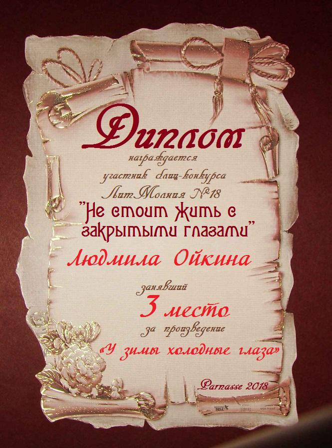 Третье место в Блиц-конкурсе №18 «Не стоит жить с закрытыми глазами» за произведение «У зимы холодные глаза». Поздравляем!
