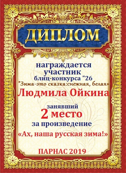 Второе место в Блиц- конкурсе №26 "Зима - это сказка: снежная, белая" за произведение «Ах, наша русская зима!». Поздравляем!
