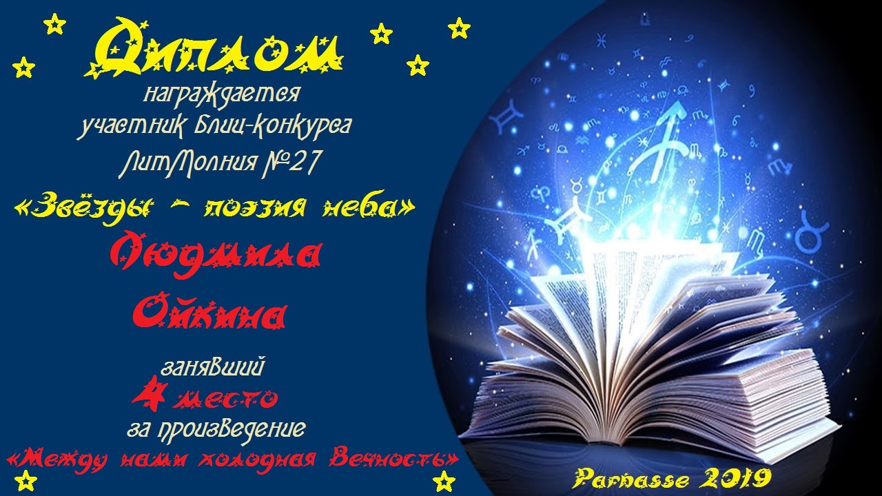 Четвёртое место в Блиц-конкурсе №27 "Звёзды - поэзия неба" за произведение «Между нами холодная Вечность». Поздравляем!