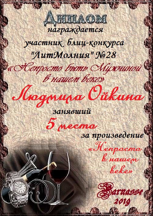 Пятое место в Блиц-конкурсе №28 "Непросто быть Мужчиной в нашем веке" за произведение «Непросто в нашем веке». Поздравляем!