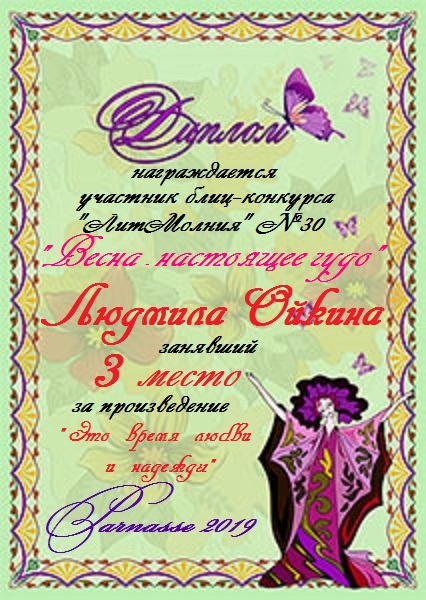 Третье место в Блиц-конкурсе №30 "Весна - настоящее чудо" за произведение «Это время любви и надежды». Поздравляем!