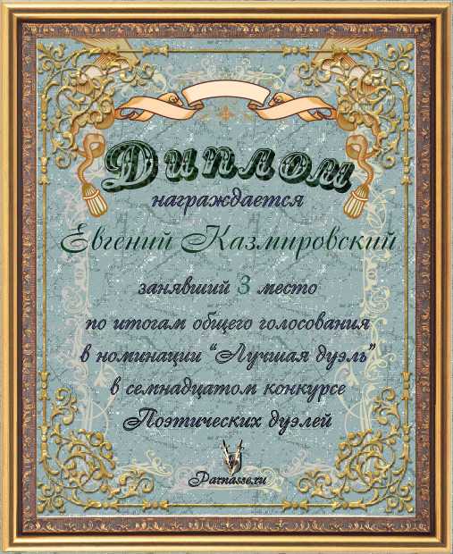 Диплом за 3-е место в номинации "ЛУЧШАЯ ДУЭЛЬ" по итогам общего голосования в 17ом конкурсе поэтических дуэлей (№ 29.1)